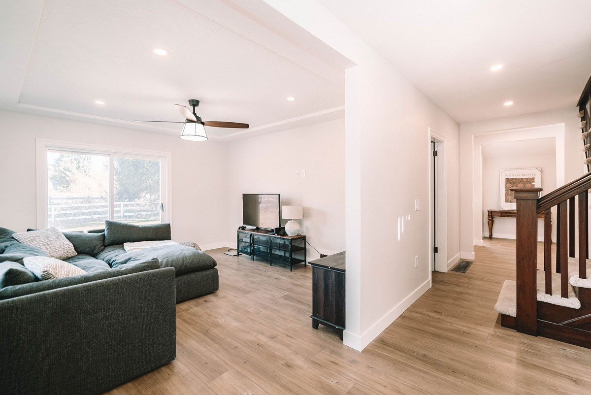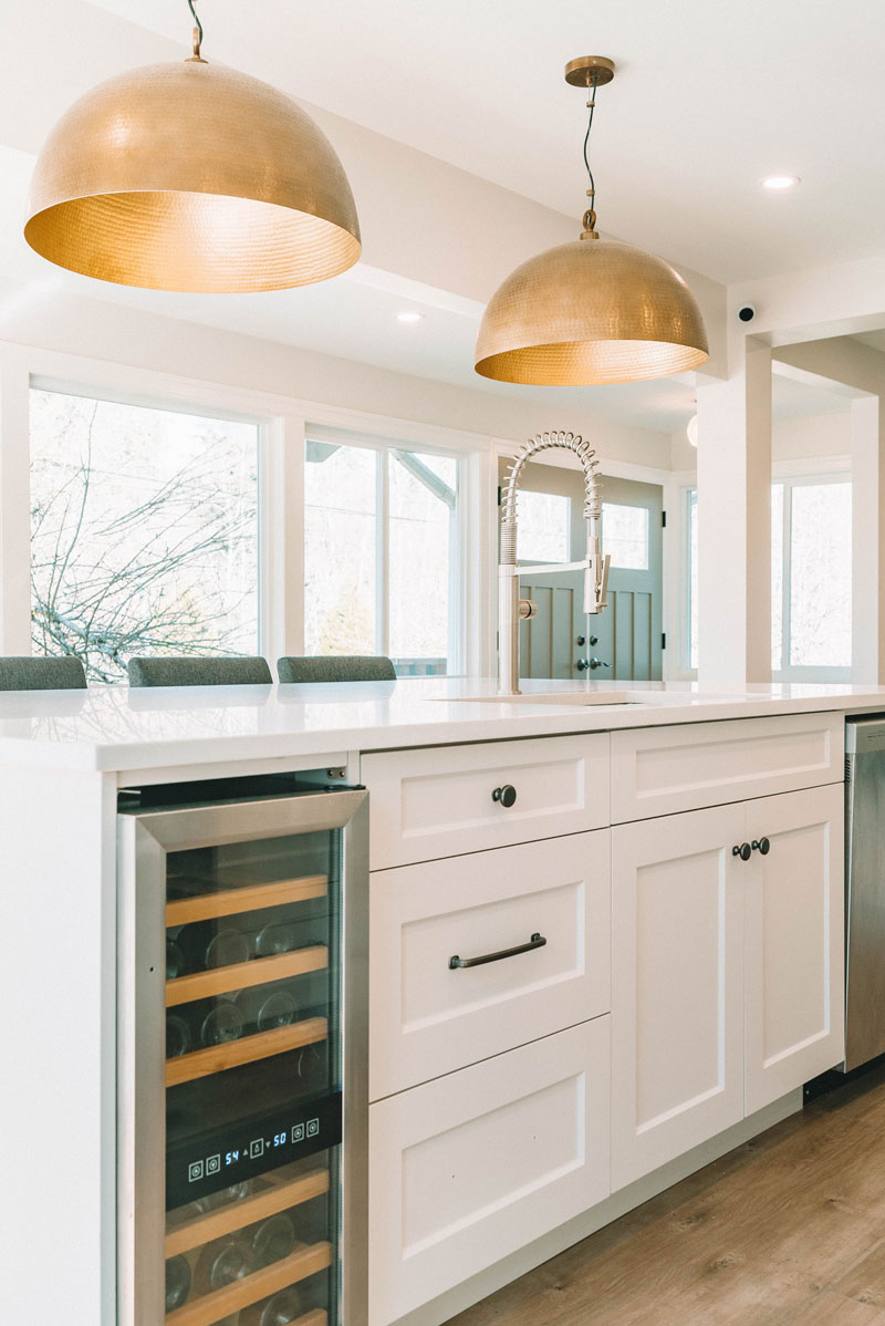 This extensive renovation took and old tired kitchen and transformed it into a modern and functional work of art. This kitchen renovation project also allowed us to work with wood beams on the ceiling to give a unique look. The entire space received new custom cabinetry with elegant hardware, an island update, white quartz tile backsplash and countertop, hood fan, appliances, kitchen sink, hard wood flooring, lighting fixtures, window and doors, plumbing and electrical.