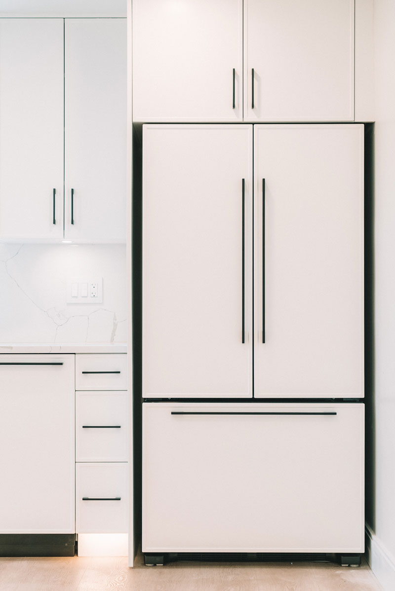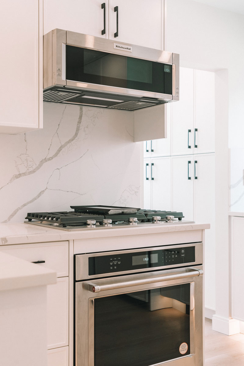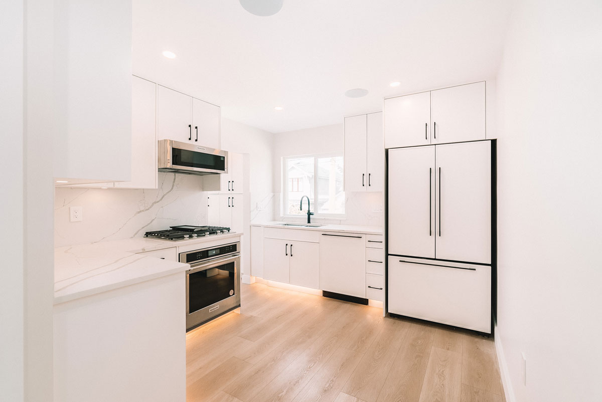 A complete kitchen renovation to create a modern, functional and stylish space. New custom cabinetry with elegant hardware, an island update, white quartz tile backsplash and countertop, hood fan, appliances, kitchen sink, hard wood flooring, lighting fixtures, window and doors, plumbing and electrical.